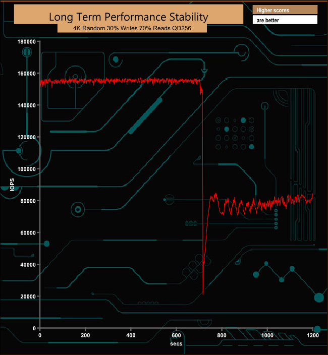 For the long term performance stability test, we set the drive up to run a 20-minute 4K random test with a 30% write, 70% read split, at a Queue Depth of 256 over the entire disk. The 400GB SNV3400-400G averaged 123,560 IOPS for the test with a performance stability of 79%, which the sort of figure want you'd want to see from a cache drive.