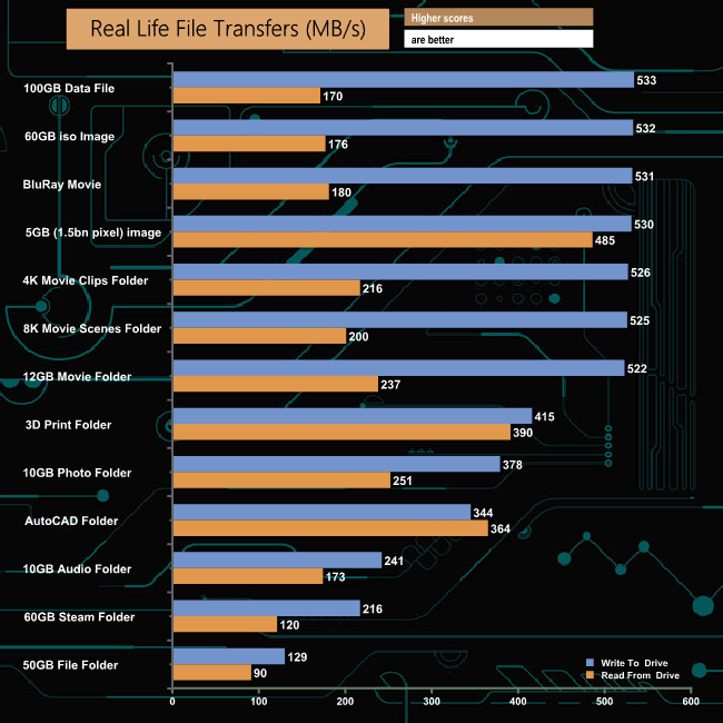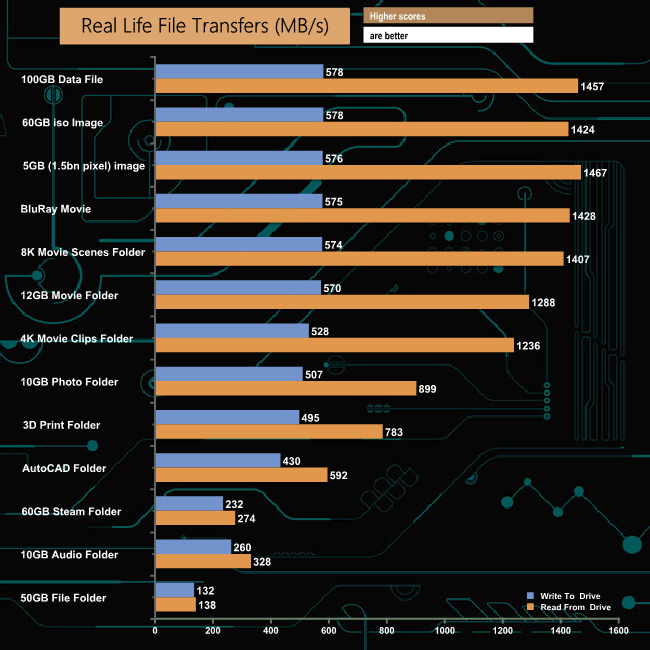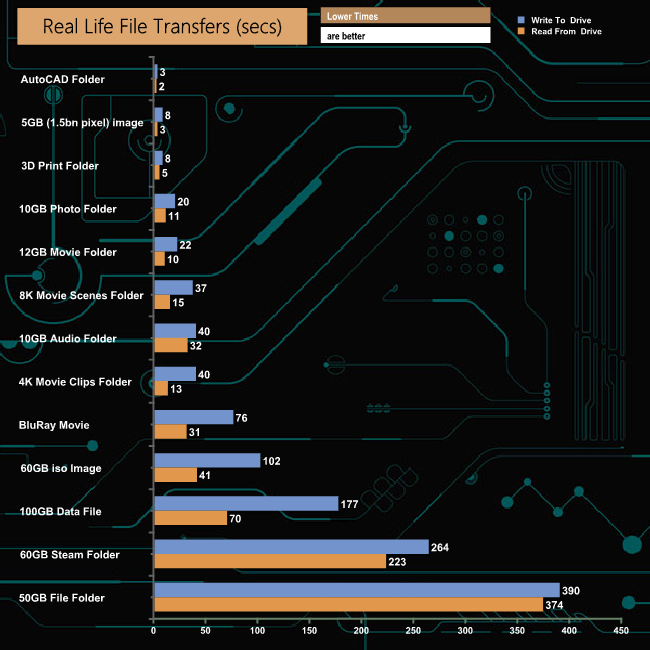 To get a measure of how much faster PCIe NVMe drives are than standard SATA SSDs we use the same files but transfer to and from a 512GB Toshiba OCZ RD400: