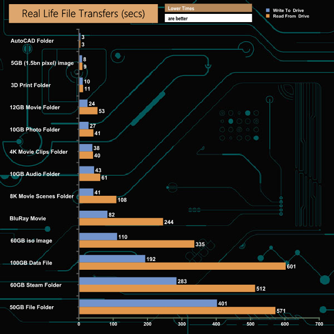To test real life performance of a drive we use a mix of folder/file types and by using the FastCopy utility (which gives a time as well as MB/s result) we record the performance of drive reading from & writing to a 256GB Samsung SSD850 PRO.