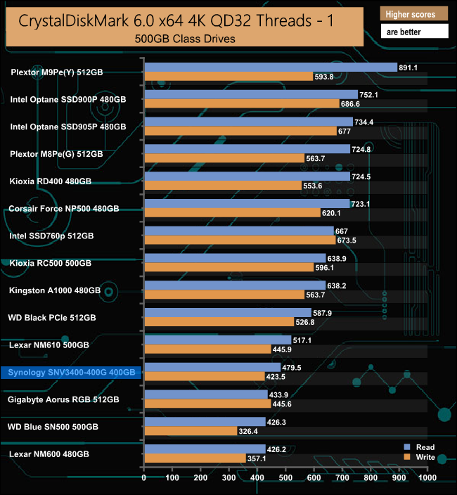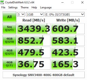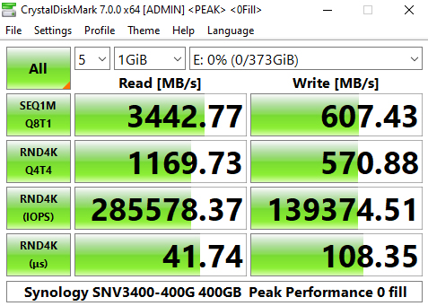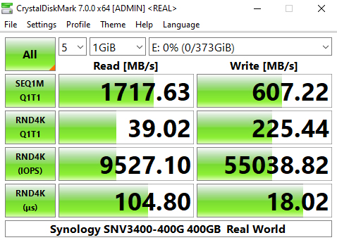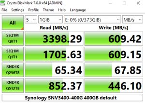 Synology's SNV3400-400G's performance in CrystalDiskMark’s deeper queue depth 4K test leaves it the bottom half of the results chart. From looking at the two benchmark result screens, it seems that the controller has a preference for handling compressible data. Using this type of data sees a big boost in the random read performance at queue depths 1 (1 thread) and 32 (8 threads).