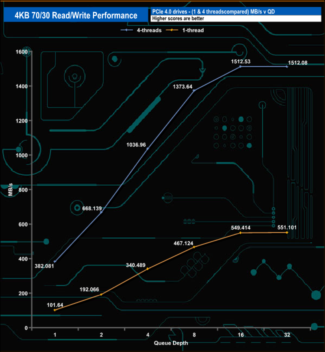 We used CrystalDiskMark 8’s custom settings to test the 4K 70/30 mixed read/write performance of the drive through a range of queue depths.