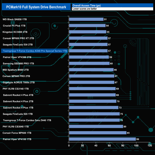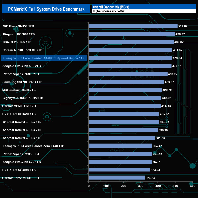 The overall bandwidth result for the drive of 479.54MB/s is good enough for fifth place on the results chart and is 115MB/s faster than Teamgroup's first-generation Gen4 drive, the T-Force Cardea Zero Z440.
