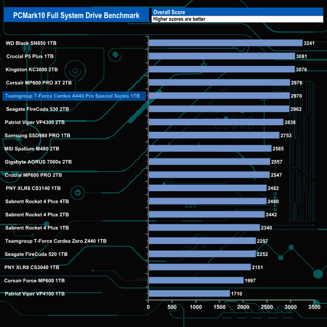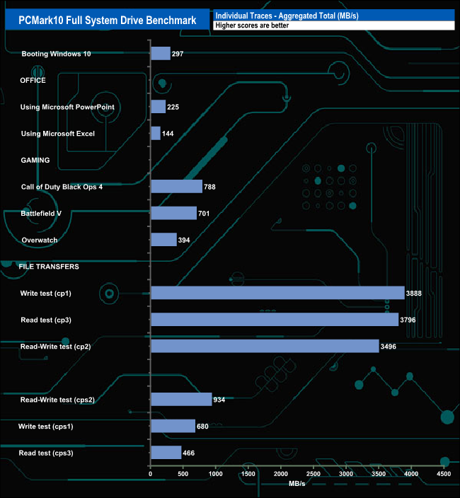 The PCMark 10 Full System Drive Benchmark uses a wide-ranging set of real-world traces from popular applications and common tasks to fully test the performance of the fastest modern drives. The benchmark is designed to measure performance of fast system drives using the SATA bus at the low end and devices connected via PCI Express at the high end.