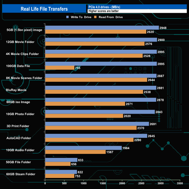 Swapping over to an all NVMe architecture saw, as you might expect transfer speeds rocket, with ten out of the thirteen write transfers topping well above 2.5GB/s. The faster write transfer was for the 5GB data file at 2,948MB/s, the slowest being the 60GB Steam folder transfer. Reading the data back the drive topped the 2GB/s mark on nine out of the thirteen tests with the 2.5GB/s mark passed five times.