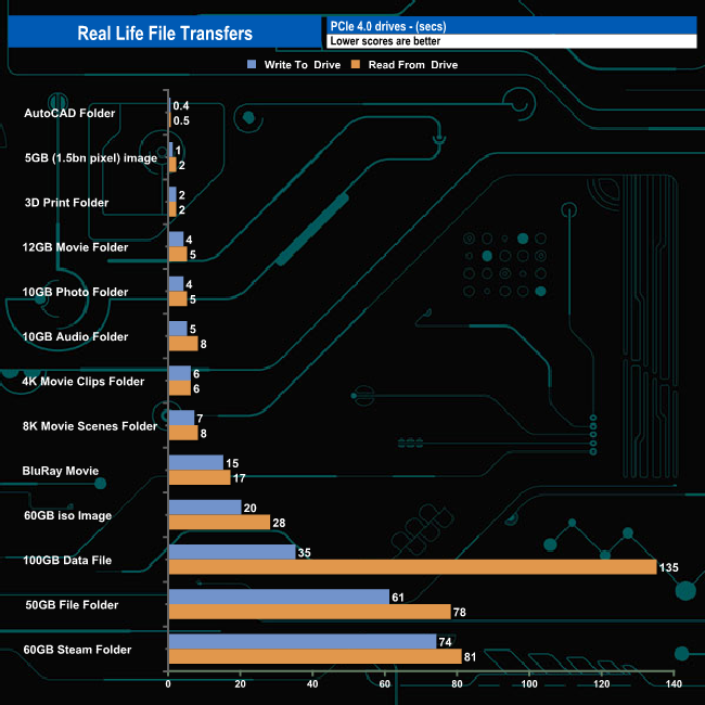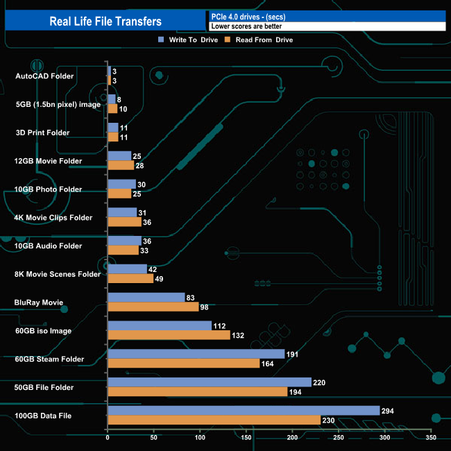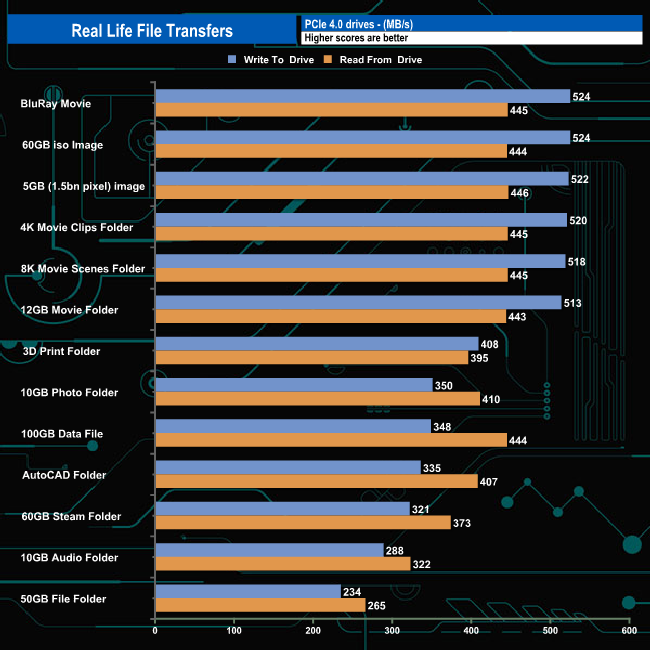 The drive averaged 415MB/s for the thirteen real-life file transfers when writing to the drive with the fastest being the 60GB iso image and the BluRay movie at 524MB/s, the slowest being the 50GB file folder transfer. Reading the data back averaged 406MB/s, the fastest being the 5GB image at 446MB/s and the slowest, the 50GB file folder once again.