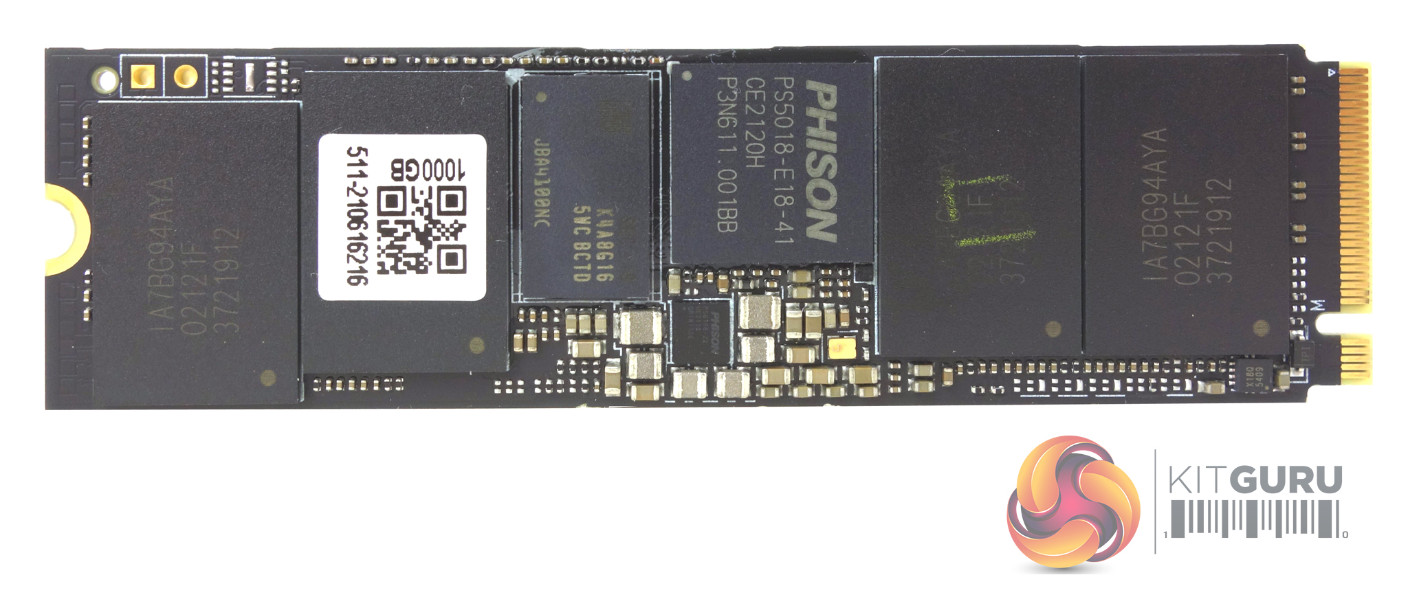 Alongside the Phison PS5018-E18-41 controller are four 256GB packages of Micron 176-layer B47R 3D TLC NAND together with a 1GB DDR4-2666 cache IC. Phison’s PS5018-E18 controller is built on a 12nm process and uses five cores, three Cortex R5 cores and a pair of Dual CoXProcessor 2.0 cores. The controller supports flash transfer rates up to 1,600 MTps and up to 8TB of TLC or QLC NAND.