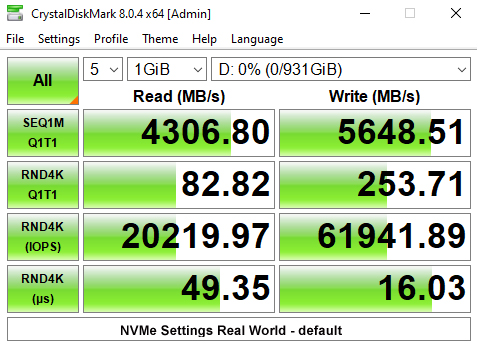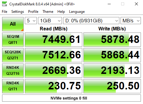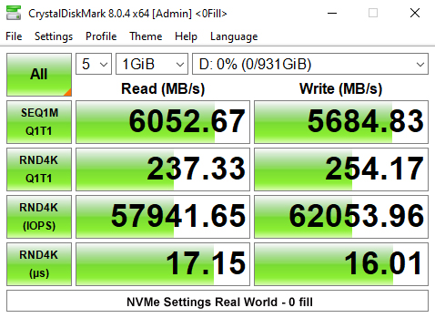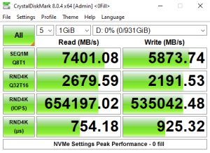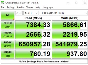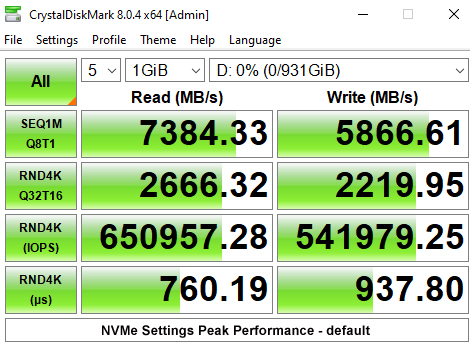Using the Peak Performance profile of CrystalDiskMark 8 we got a Sequential read score of 7,384MB/s, an increase of 184MB/s over the official maximum while the 5,866MB/s Sequential write score was 134MB/s shy of the official maximum at 5,866MB/s.