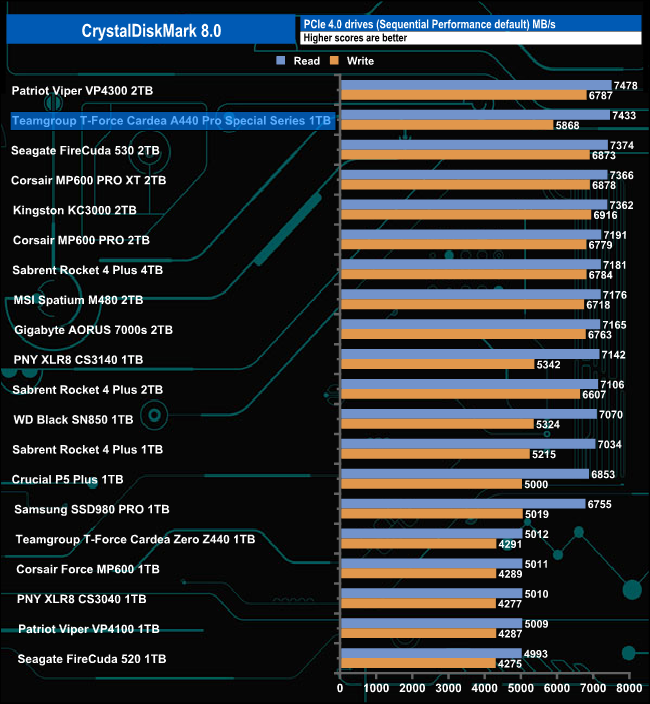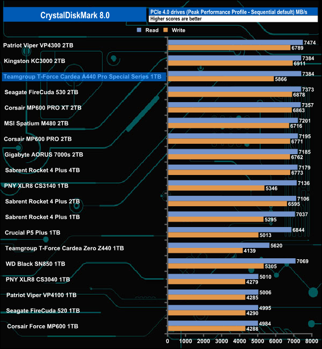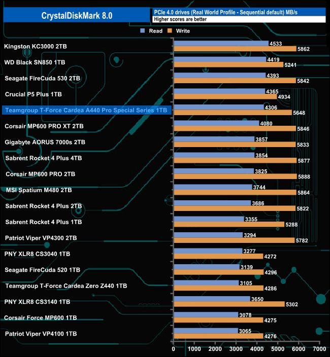 Using the Real World profile of CrystalDiskMark8, the latest T-Force Cardea A440 Pro Special Series drive produces a Sequential read score that is 1,201MB/s faster than the first generation TeamGroup Gen4 drive, the T-Force Cardea Zero Z440. Writes show an even bigger improvement at 1,362MB/s.