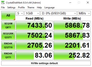 Teamgroup quotes Sequential read/write figures for the drive as up to 7,200MB/s and 6,000MB/s respectively. Using the default CrystalDiskMark 8 test we could confirm the official read figure with a result of 7,433MB/s. As for writes, the test result of 5,868MB/s is just a wee bit shy of the official maximum figure.