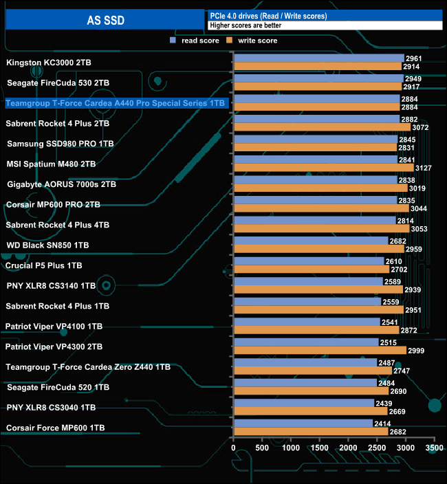 The AS-SSD read score of 2884 puts the drive into third place in our results chart behind Kingston's KC3000 and Seagate FireCuda 530 drives.