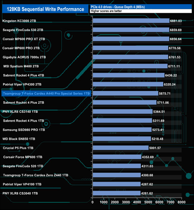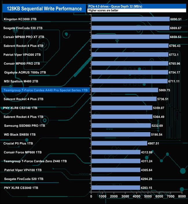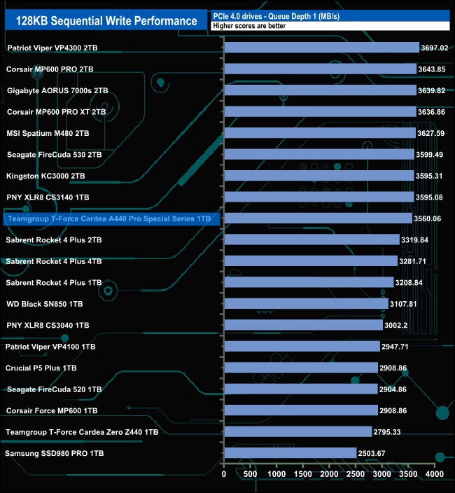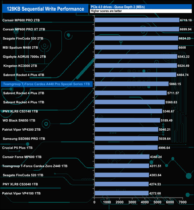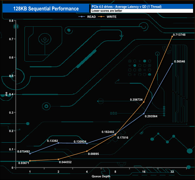When it comes to Sequential writes, the drive sits in a mid-table position throughout all the tested queue depths.