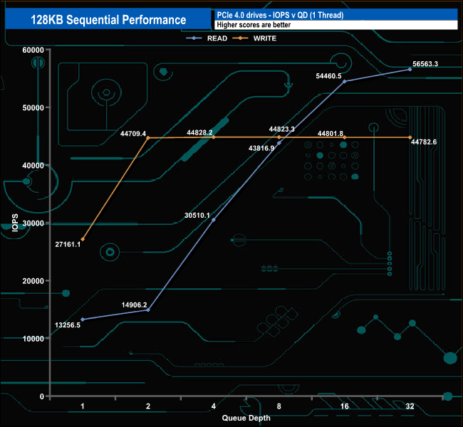 Transfer Request Size: 128KB, Thread(s): 1, Outstanding I/O: 1-32.