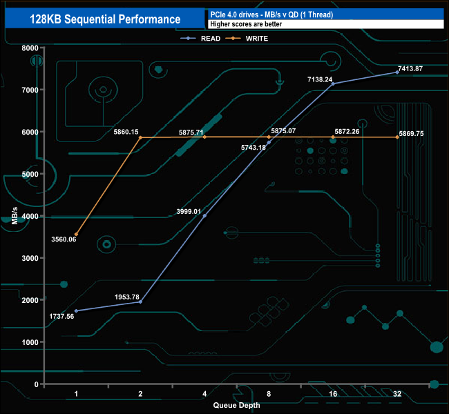 At a queue depth of 32, the drive produces a test result of 7,413.87MB/s confirming the official maximum figure of 7,200MB/s. Writes peaked at 5,875.71 (QD2) before dropping slightly to finish the test run (QD32) at 5,869.75MB/s, both figures being shy of the official 6,000MB/s maximum.
