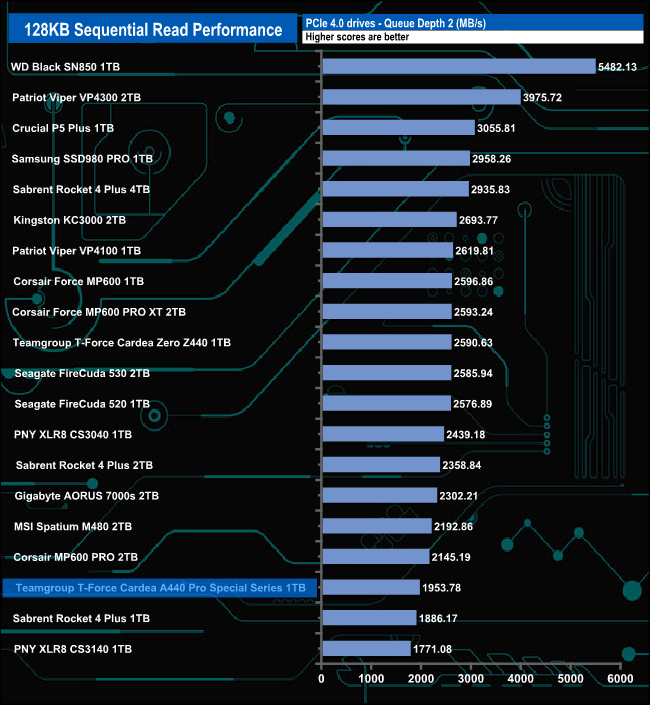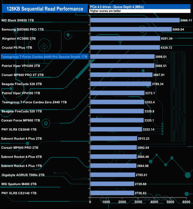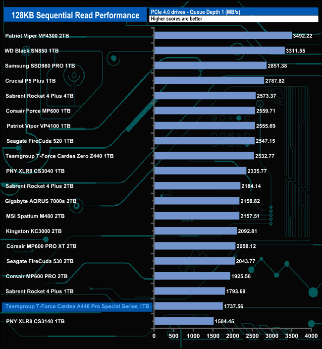 At QDs 1 and 2 the drive sits near the bottom of the results chart. However, by QD4 it has rocketed up the chart until at QD32 it sits in third place behind the Patriot Viper VP4300 and Kingston's KC3000 drives.