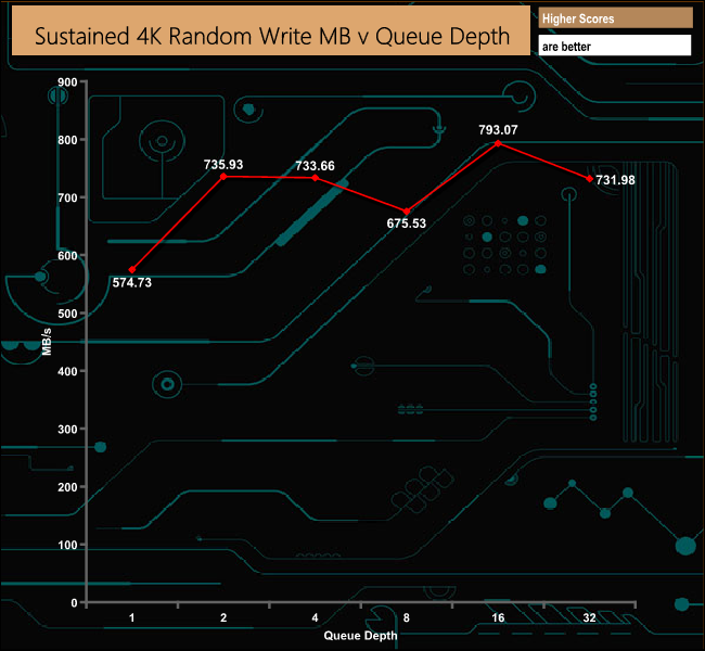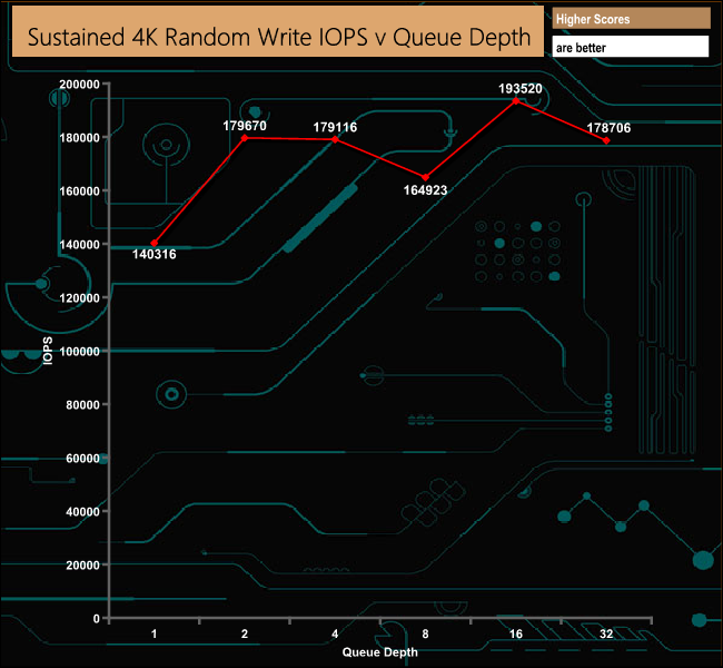 As with random reads, the maximum random write figure for the drive is 750,000 IOPS. Once again we couldn't get close to this figure with our tests, the best IOPS figure we could get was at a QD of 16 at 193,520 IOPS.