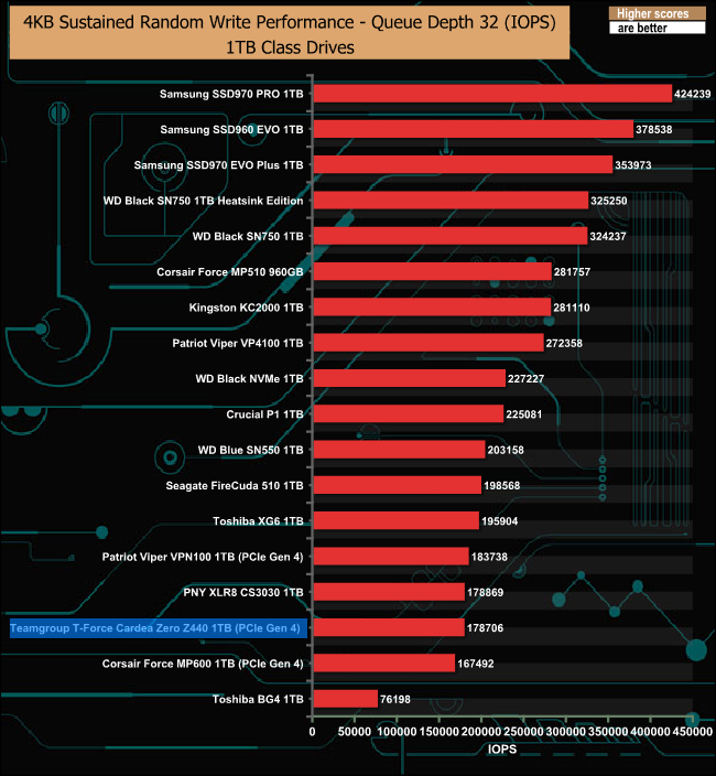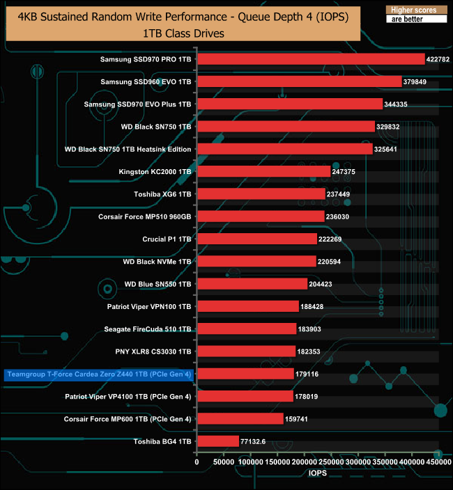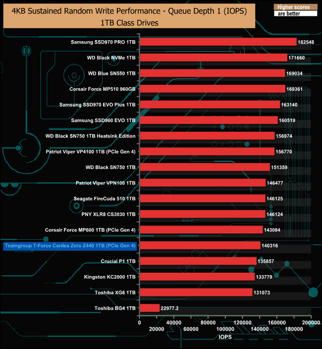 Compared to the other two PCIe Gen 4 drives, the best random write performance of the T-Force Cardea Zero Z440 comes at QD's 2 and 4 where it is the quickest of the three drives.