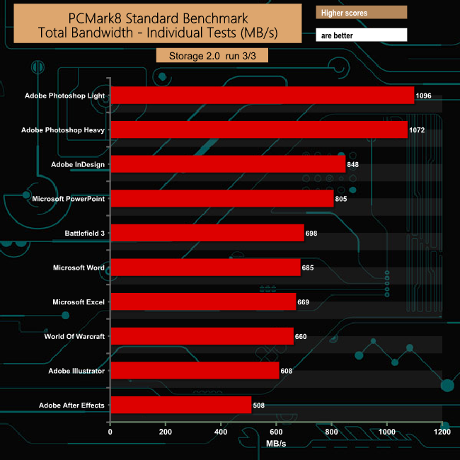 Just like the Consistency test, PCMark 8’s Standard Storage test also saves a large amount of performance data. The default test runs through the test suite of 10 applications three times. Here we show the total bandwidth performance for each of the individual test suites for the third and final benchmark run.