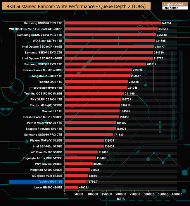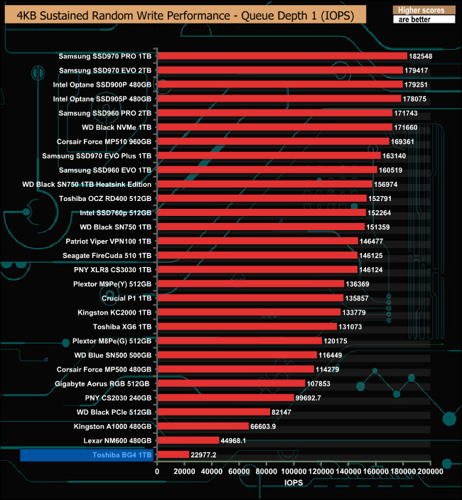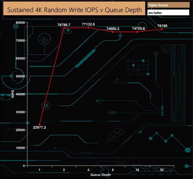 When tested with our 4K random write tests using 4 threads, the results we got from the drive were disappointing to say the least. The best figure we got was 77,132 IOPS, nowhere close to the official maximum figure of 200,000 IOPS.