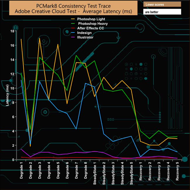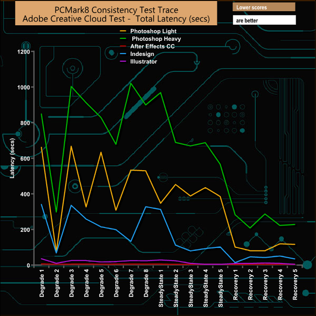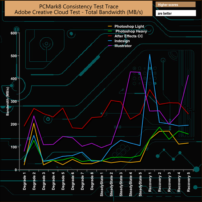 The drive doesn't handle the Adobe CC test to well at all, with the Adobe Photoshop Heavy, Photoshop Light and Indesign tests all struggling for bandwidth throughout the Degradation and Steady State phases. There is a huge performance spike in the first recovery run of the Indesign test trace, but it very rapidly drops back down.