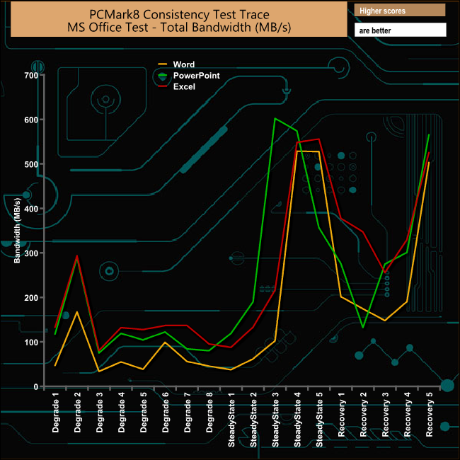 The drive also struggles with the MS Office part of the test. It’s usually the MS Office trace that causes most problems but with the BG4, all three test traces causes it problems during the latter stages of the Degradation phases. The drive does stage a remarkable recovery during the most of the Steady State runs but, very oddly the performance drops again during the early Recovery phases.