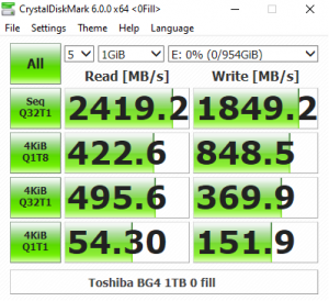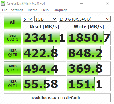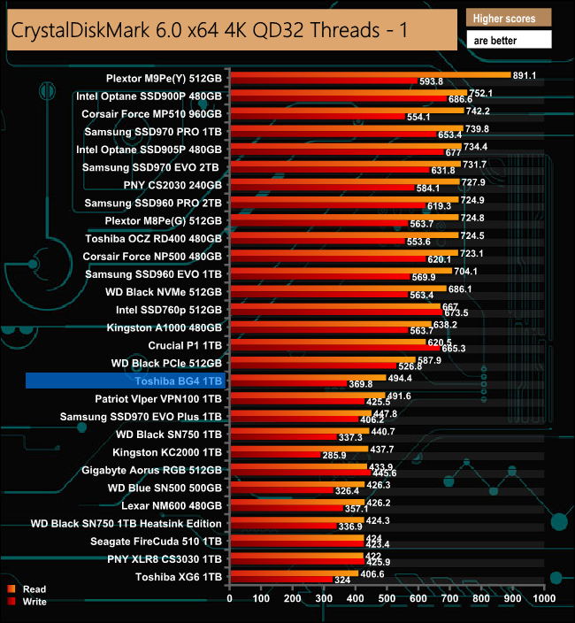 The 1TB BG4 is faster than the previous Toshiba OEM drive we reviewed, the 1TB XG6, in the CrystalDiskMark benchmark at a QD of 32. The BG4 produced read/write figures of 494MB/s and 369.8MB/s respectively compared to the 406.6MB/s read and 324MB/s write results of the XG6.