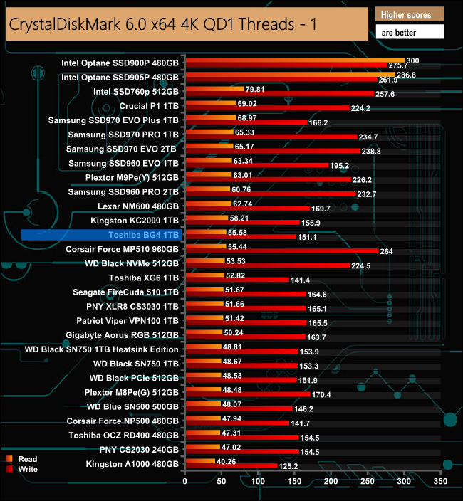 At a QD of 1, once again the BG4 is faster than the XG6, but this time the gap is a lot narrower for both reads and writes. Looking at both benchmark result screens, the Toshiba controller in the BG4 doesn't seem to have a preference for which type of data it's being asked to handle.