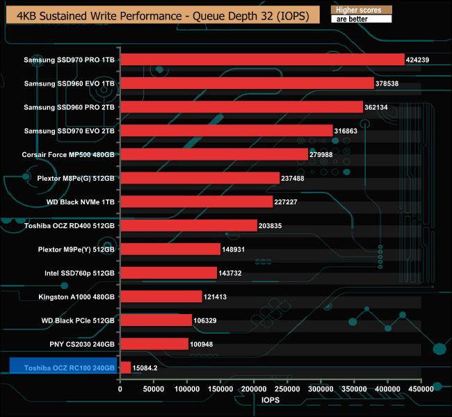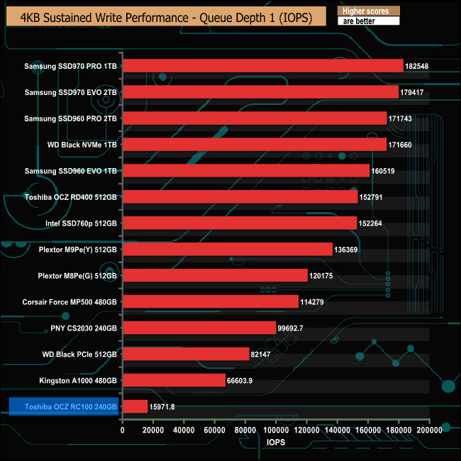Throughout the queue depth range, our RC100 really struggled with the 4K random write tests as can be seen by the very low IOPS scores.