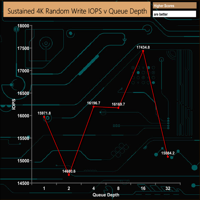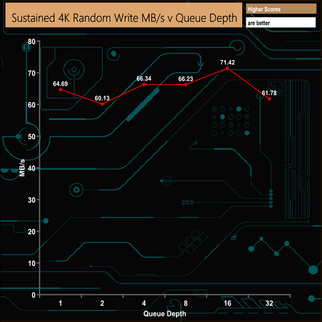 Most desktop operations happen in the 1 – 4 queue depth range, so we’ve broken out the test results to see how the drive performs at these queue depths in comparison with other drives, as well as at a queue depth of 32 – although in the desktop environment you’ll seldom, if ever, see a queue depth that high.