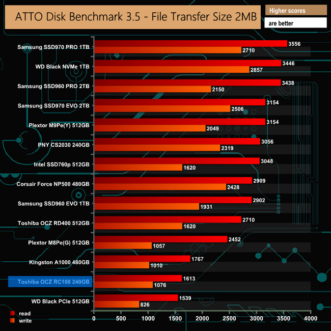 The official sequential read/write figures for the 240GB RC100 are up to 1,600MB/s for reads and up to 1,050MB/s for writes, both figures we could confirm with the ATTO benchmark.