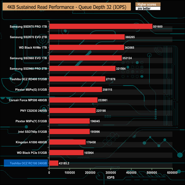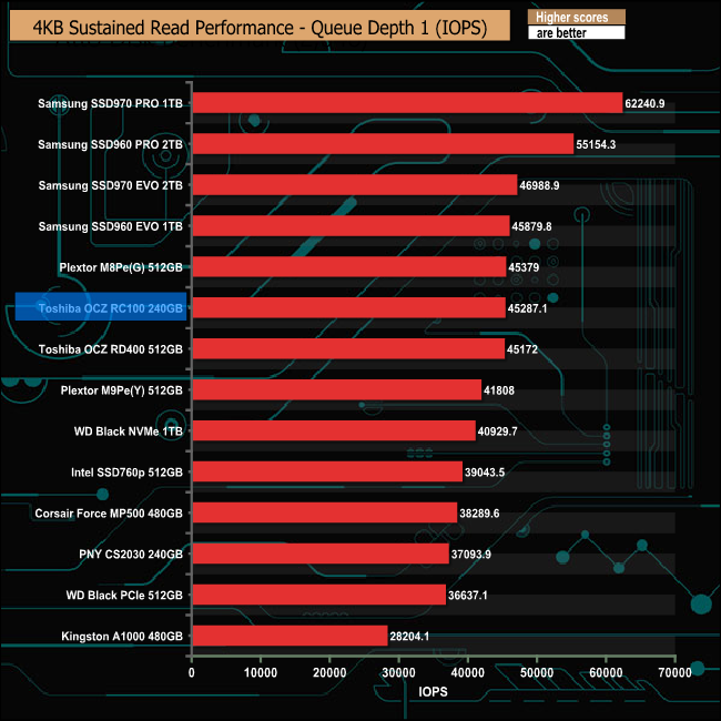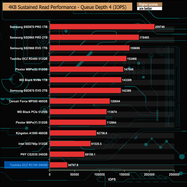 The official 4K random read/write figures for the 240GB drive are up to 130,000 IOPS for reads and up to 110.000 IOPS for writes. Unfortunately in our 4K testing we couldn't get anywhere near that read figure, with the drive topping out at 43,185 IOPS.