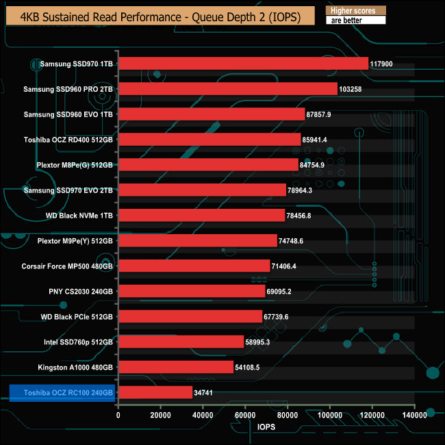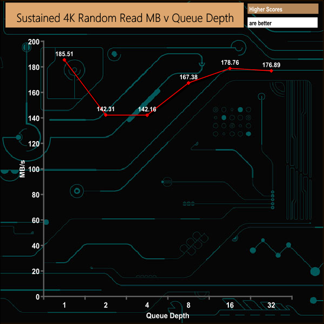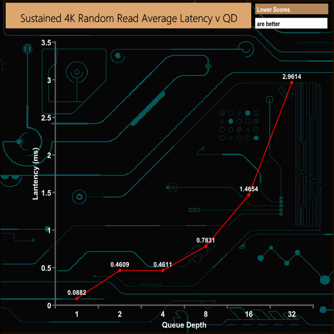 Most desktop operations happen in the 1 – 4 queue depth range, so we’ve broken out the test results to see how the drive performs at these queue depths in comparison with other drives, as well as at a queue depth of 32 – although in the desktop environment you’ll seldom, if ever, see a queue depth that high.