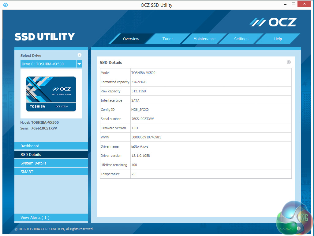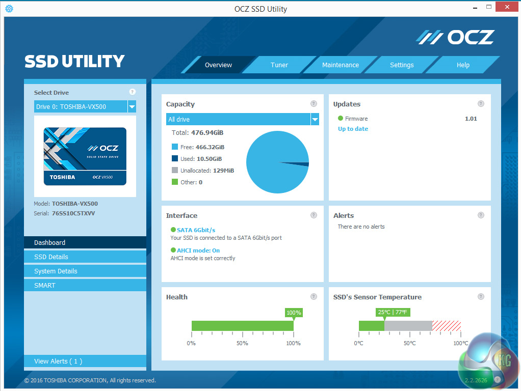 The SSD management software is called SSD Utility. While the name might be a bit bland the software has some useful features. Dashboard is the main page and shows drive capacity and how it's being used, firmware information, a readout from the drive's temperature sensor and the drive's health.