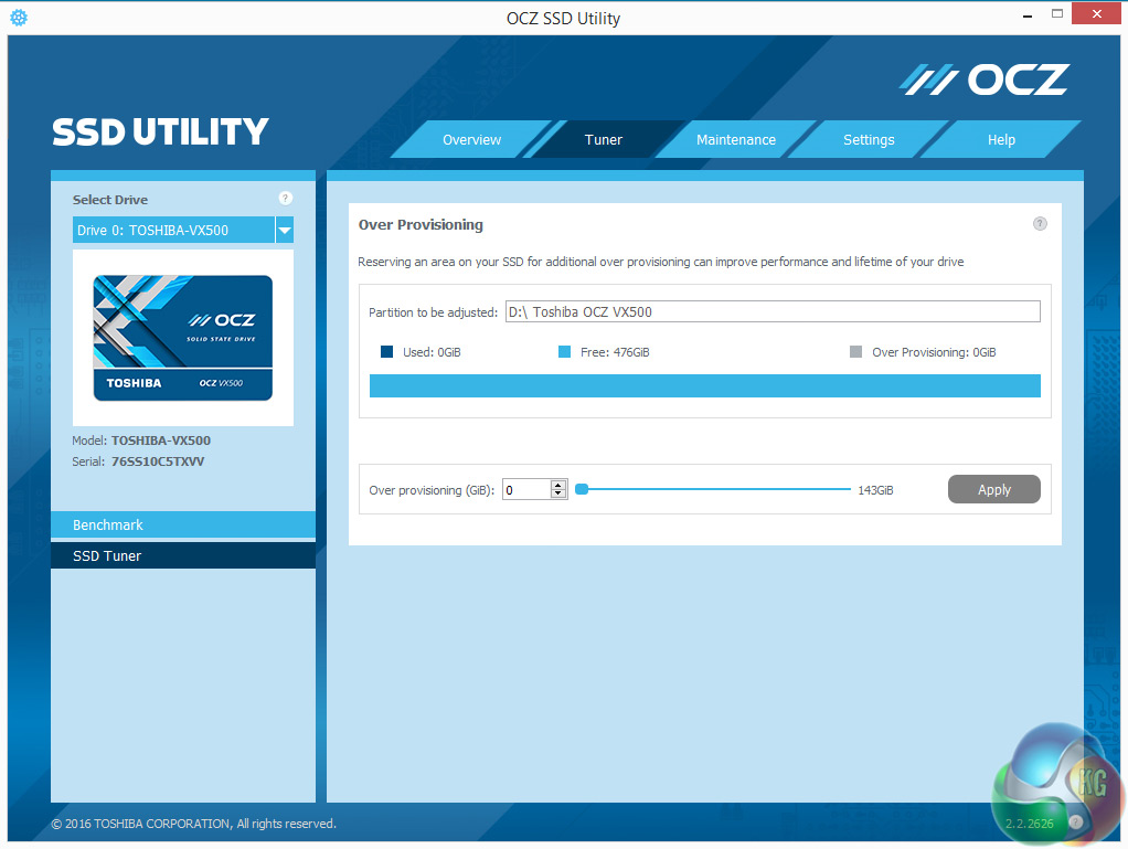 There's also a built-in performance benchmark, the ability to securely erase the drive, update the firmware and to set the over-provisioning level.