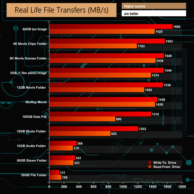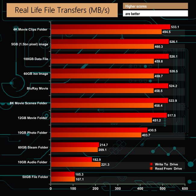 Our real-life file transfer test proved no obstacle for the drive. As always with this test, it's dealing with the small file sizes in the 60GB Steam, 50GB File and 10GB Audio folders that slows the drive down.