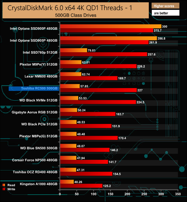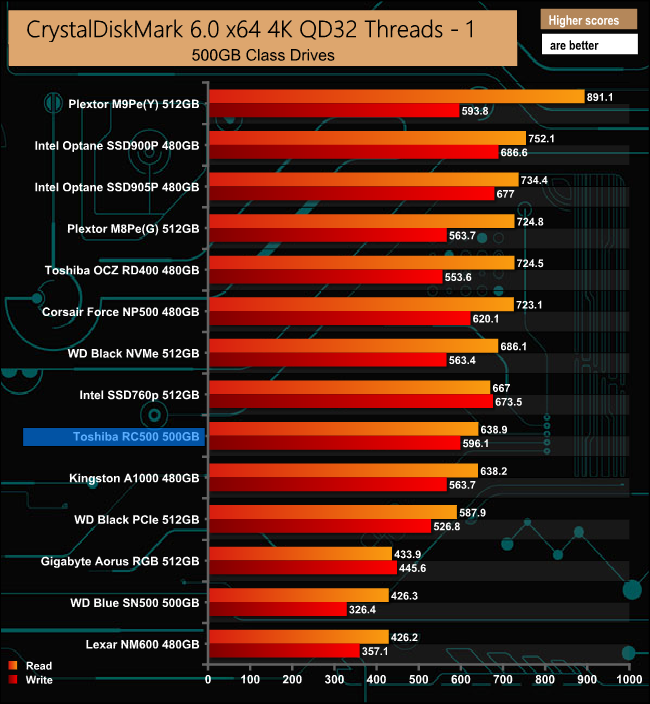 The RC500 shows stronger performance, especially writes at QD1, which is where most of the workloads of normal everyday use occur.