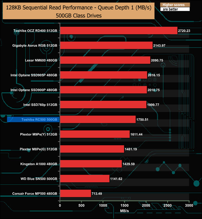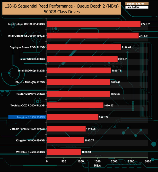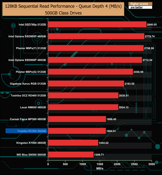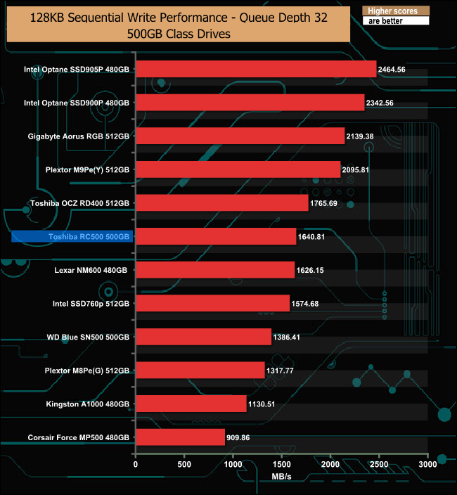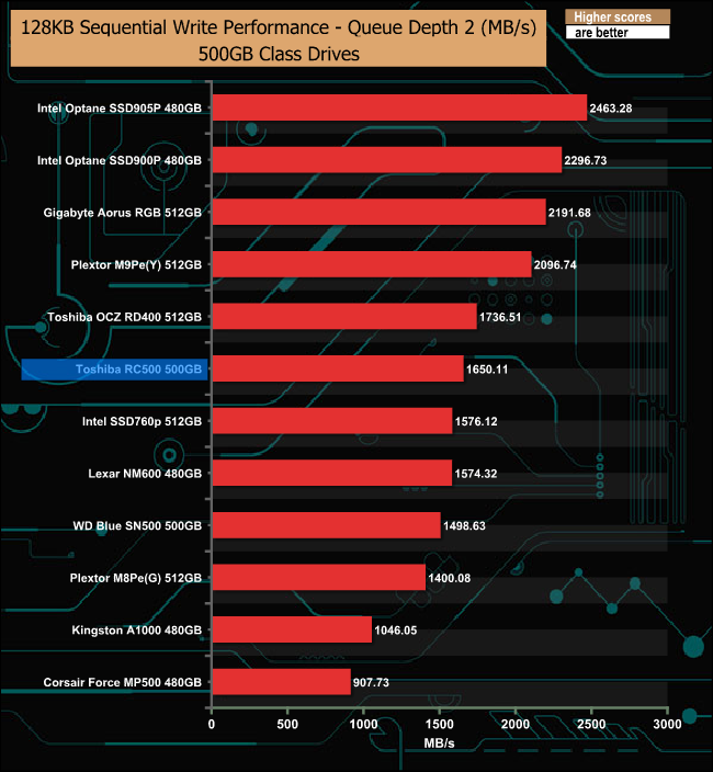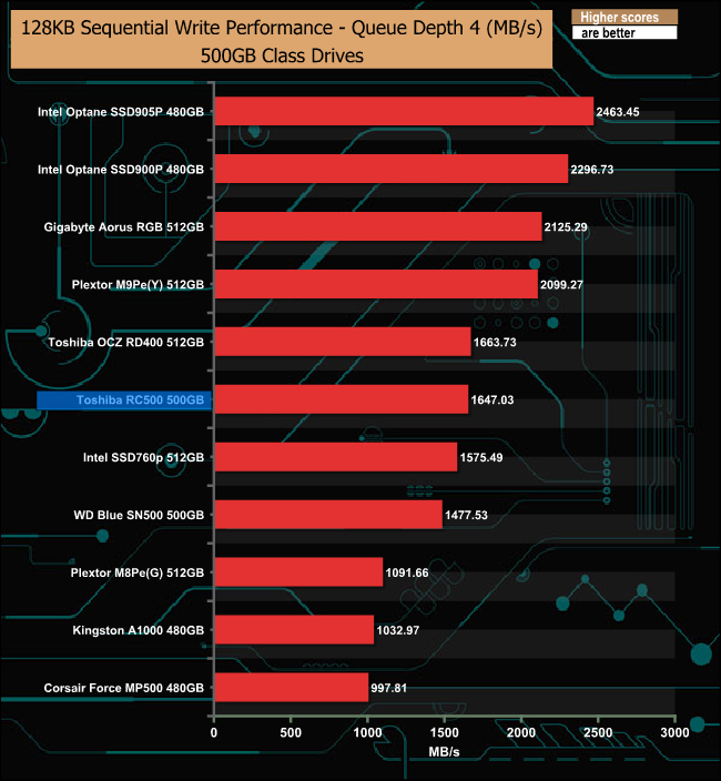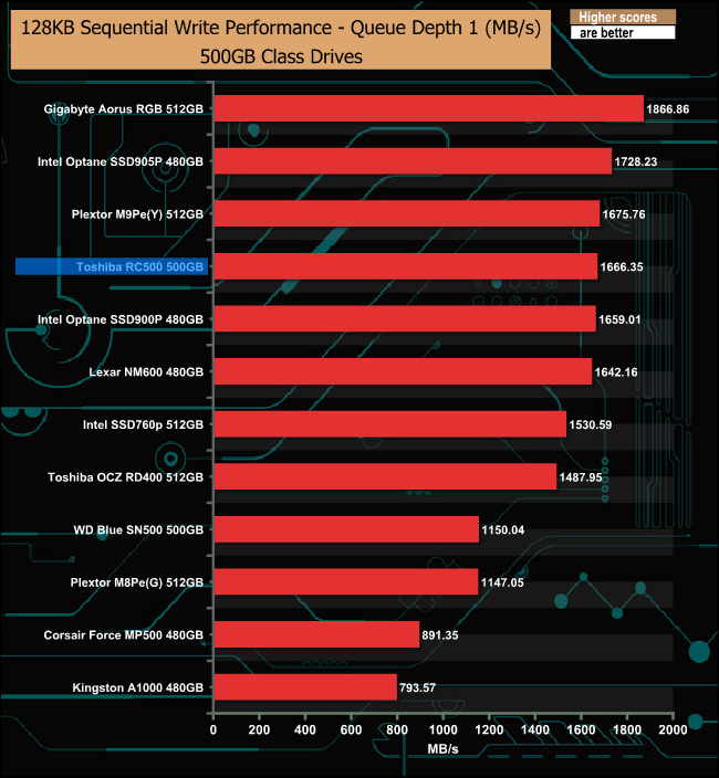 The Sequential write performance of the RC500 is much more consistent than the read, throughout the tested QD's.