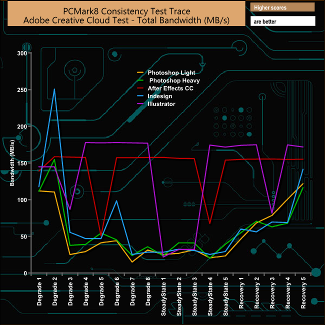 PCMark 8’s Consistency test provides a huge amount of performance data, so here we’ve looked a little closer at how the 960GB Toshiba TR200 performs in each of the benchmarks test suites.