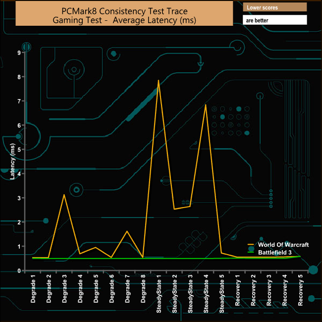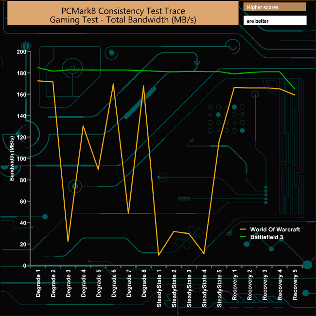 In the casual gaming tests, the drive performance suffers quite badly during the World Of Warcraft tests but recovers pretty well. During the Battlefield 3 tests, the drive hardly seems to notice its being tested showing excellent consistency throughout the tests. In fact the only time it seems to be stressed is during the final parts of the recovery phase.