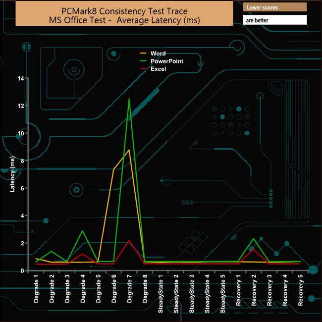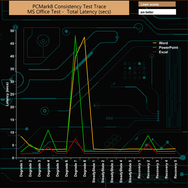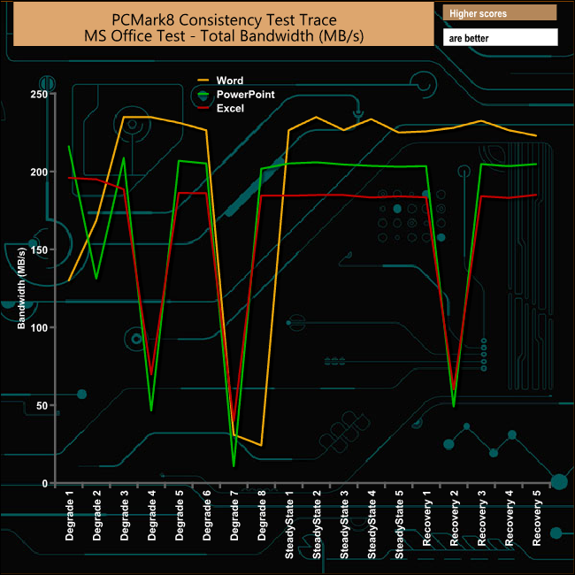 The TR200 has a hard time during the Office tests with the drive being hit hard during the Excel and Powerpoint tests in both the early and latter stages of the degradation phase. The the Word test run also suffers badly at the end of the degradation phase. The recovery stage during the Word test is far more consistent than the other two tests.