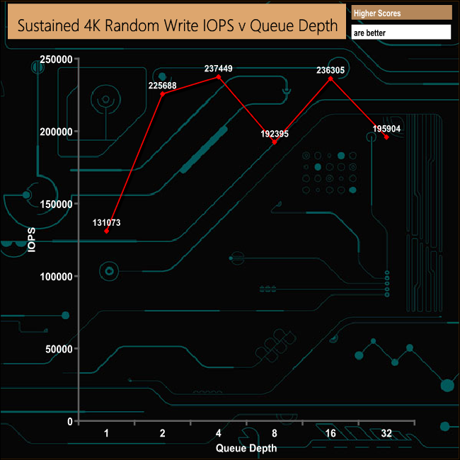The random write performance of the drive improves in queue depths 2 and 4 compared to the relatively low IOPS figures at QD1 and QD32.
