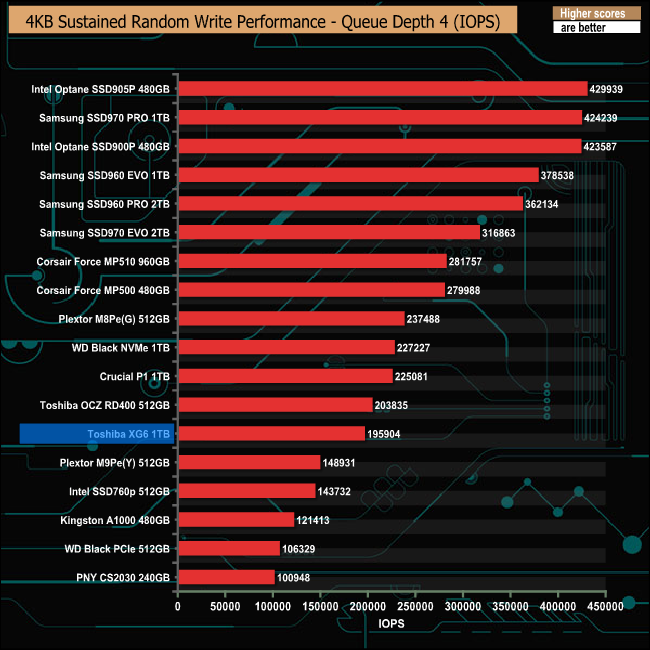 Under our 4K random write tests, the XG6 displays a real drop in performance at queue depths 8 and 32. The maximum IOPS figure we got from the drive was 237,449 IOPS which is a fair way off the official figure of 365,000 IOPS.