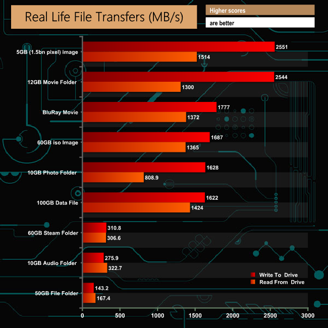 It's the same story with the NVMe to NVMe transfer tests with the drive handling larger files much more easily than the small ones. Best performances from this test came from the 5GB Photo transfer (2,551MB/s) and the 12GB Movie Folder (2,544MB/s).