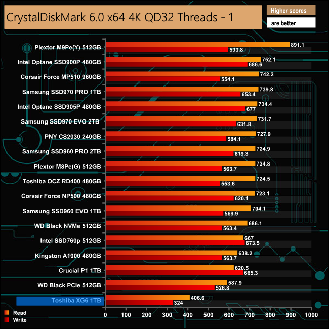 When tested at a queue depth of 32 using CrystalDiskMark the performance of the XG6 lags behind all the other drives we've tested in both read and writes. However testing the drive at a QD of 1 which is much more like the level it will face in real life, the drive performs reasonably well.