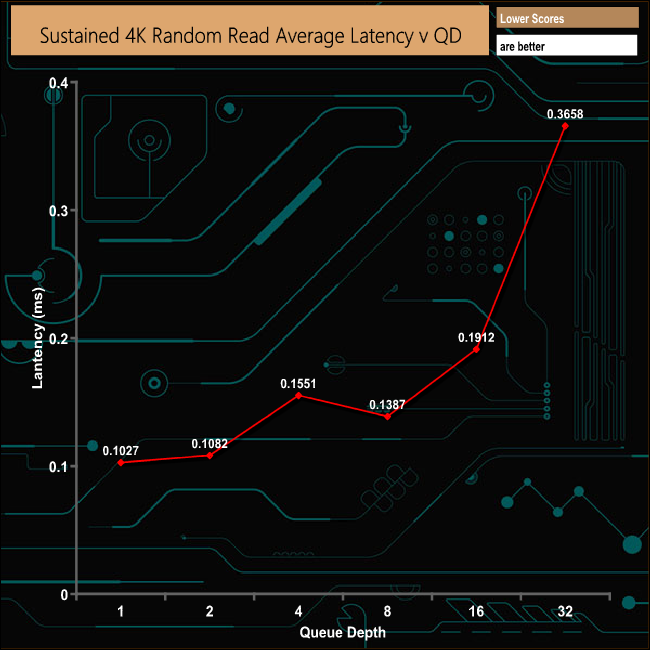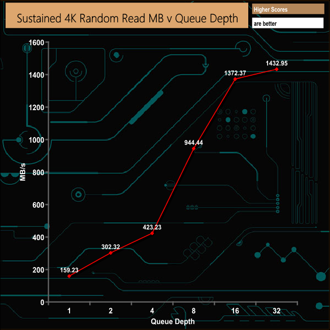 The drive's performance at a deeper queue depth of 32 is much more impressive than at shallower queue depths.