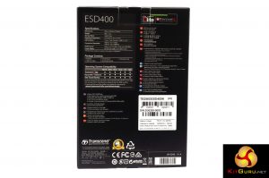 The ESD400 comes in a windowed box allowing the drive to be displayed. The front of the box has the drive's capacity, drive speed and interface clearly marked under the window section while to the right of the window is a vertically stacked row of icons that describe the drive's main features.