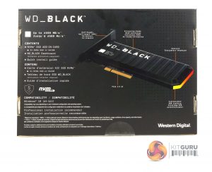 The rear of the box has another image of the drive from a different angle. Some of the drives features are labelled on the image and to the side is a box contents list. As with the front of the box, everything is repeated in French.
