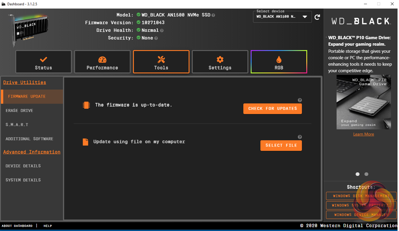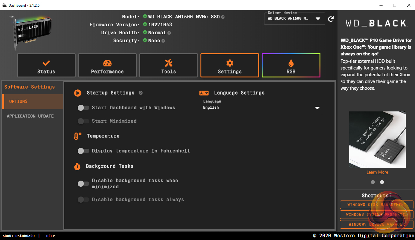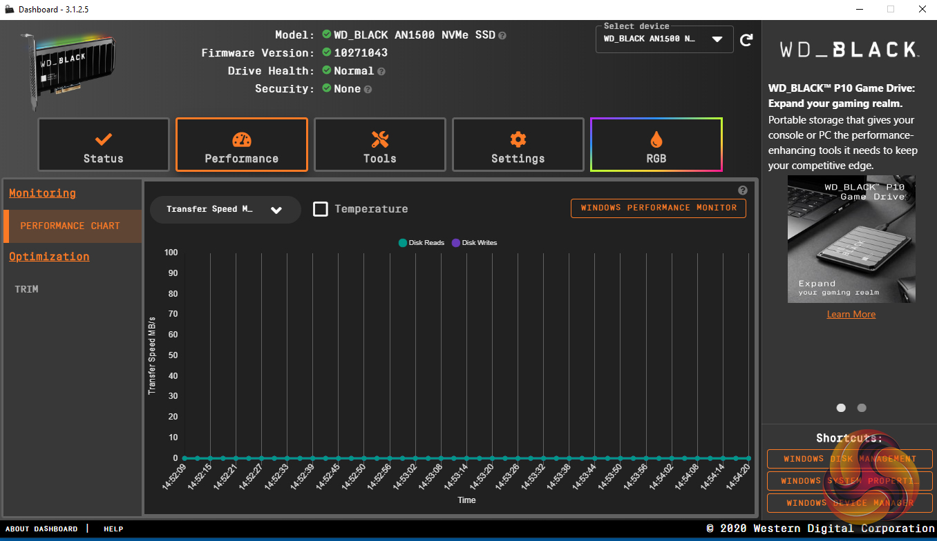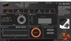 WD's revamped SSD Dashboard (v3.1.25 supports the AN1500) is about as comprehensive an SSD management utility as you'll likely to find. It displays information on drive temperature, life remaining and a whole lot more including a live performance monitor. There isn't any cloning utility incorporated into the dashboard but WD supports the AN1500 with Acronis True Image WD Edition which can download from WD's website.