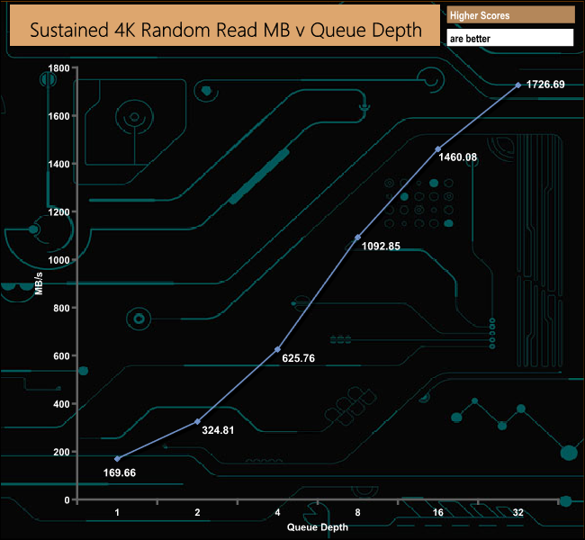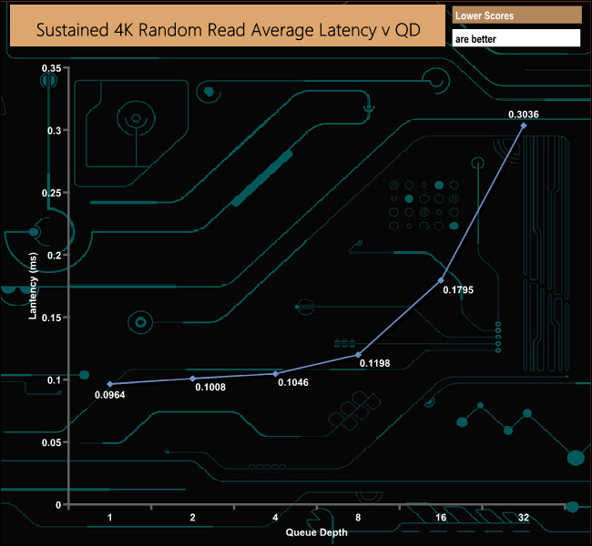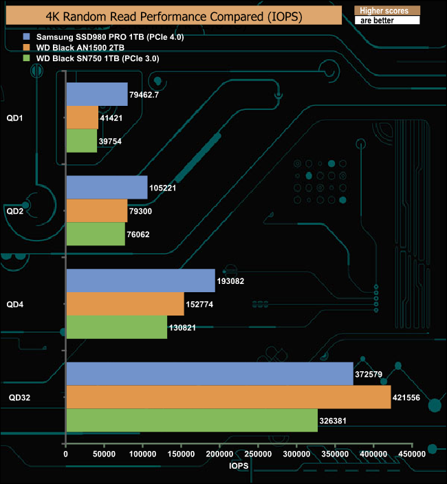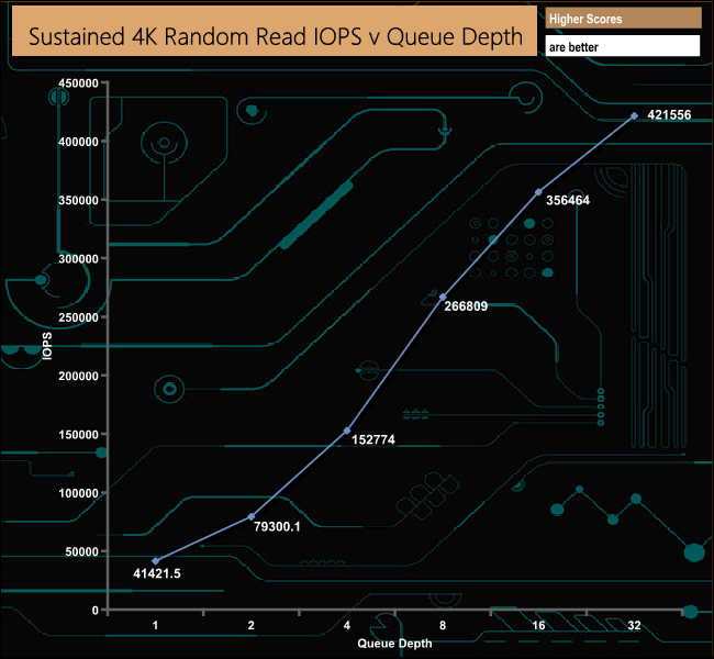 In our 4-threaded 4K testing, the Samsung SSD980 PRO outpaces the AN1500 until QD32 when the AN1500 outperforms the PCIe 4.0 drive, although the test result of 421,556 IOPS is way off of the official maximum random read figure of 780,000 IOPS.