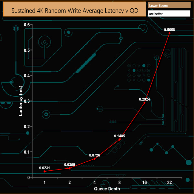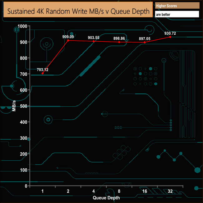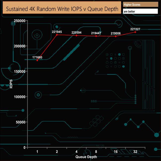 As with the 4K random read result, our 4K random write figure of 227,227 IOPS fell well short of the quoted official maximum of up to 400,000 IOPS. But even so, the test result figure is still very good for a consumer drive.