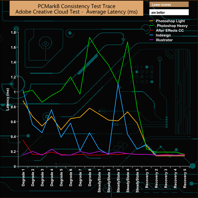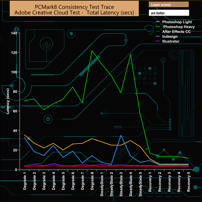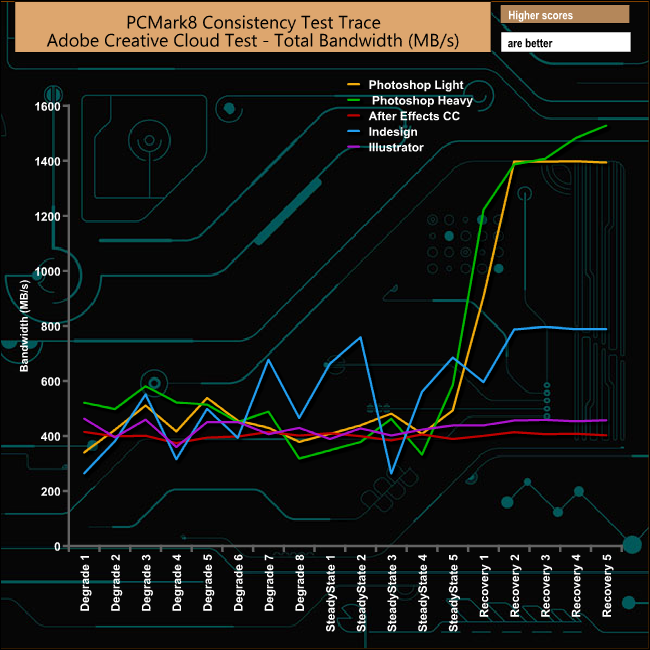 In the Adobe CC suite of tests, the drive did take some hits in performance during the Degradation and Steady State phases but it recovered very well, particularly in the two demanding Photoshop test traces.